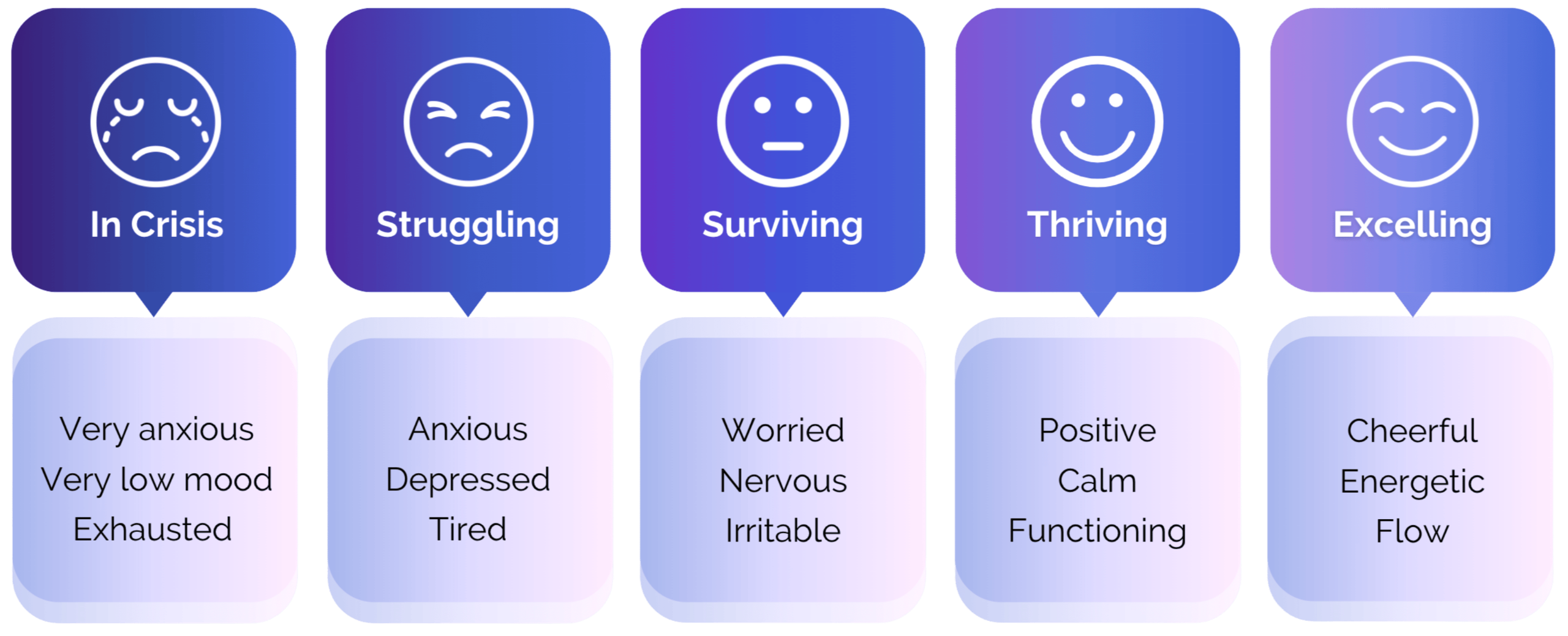 This continuum-based understanding aligns closely with Infijoy’s educational positioning. Our courses are not designed to address pathology, but to support movement along the wellbeing spectrum — from stagnation toward engagement, meaning, and psychological vitality. This continuum-based understanding of wellbeing is visually reflected in the progression illustrated below, which depicts movement from states of crisis and struggle, through survival and functioning, toward thriving and excelling. Importantly, the continuum does not imply fixed categories or diagnoses, but rather recognises that individuals may move fluidly along different points over time, depending on internal resources, external circumstances, and available support. Infijoy’s courses are designed to support this natural movement along the spectrum by strengthening psychological resources, self-awareness, and adaptive capacity, rather than treating wellbeing as an all-or-nothing state.